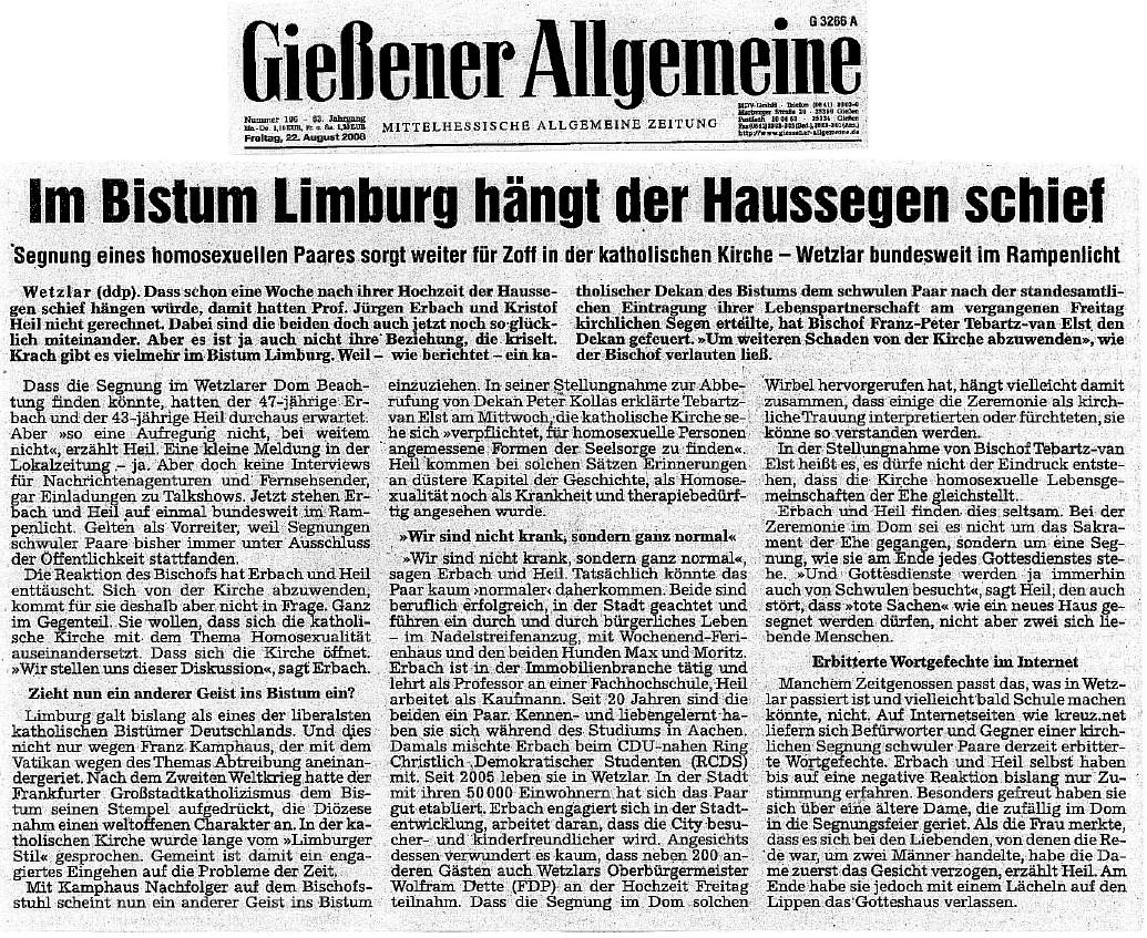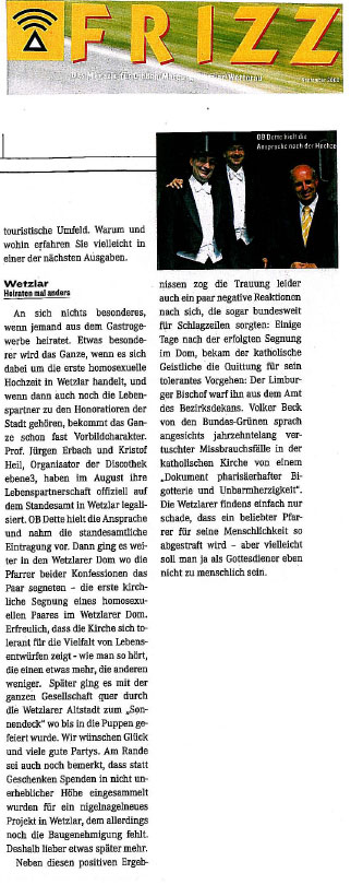 – Professor in Holzminden, Vorsitzender des Fördervereins „Wetzlar - Stadt der Optik“– und und sein langjähriger Lebensgefährte Kristof Heil haben gestern ihre Partnerschaft „legalisiert“. Ein öffentliches Ereignis: Oberbürgermeister Wolfram Dette (FDP) hielt die Trauansprache in der Alten Aula, wo die standesamtliche Eintragung der Partnerschaft vorgenommen wurde.