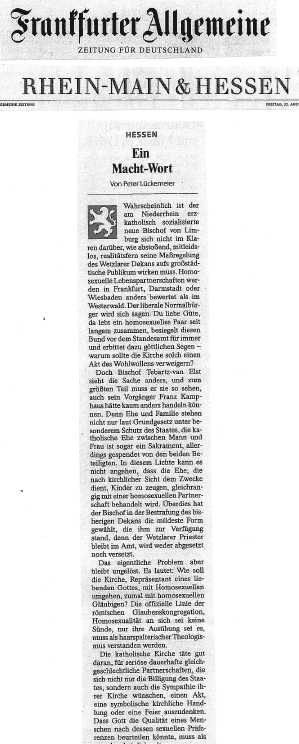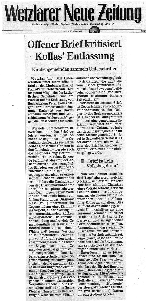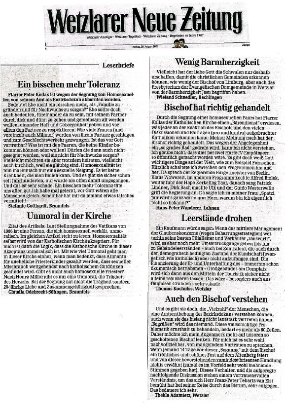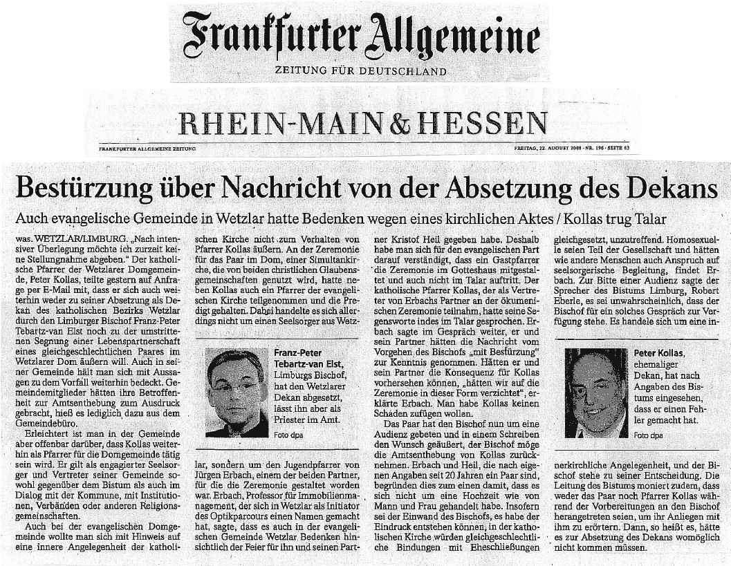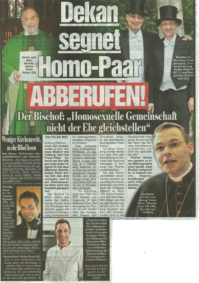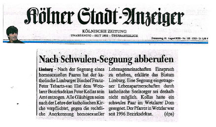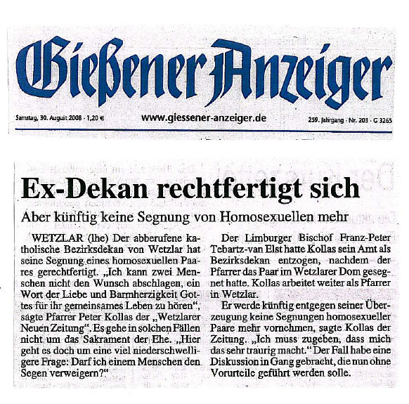 {mosimage}Wetzlar  (ako). Am Mittwoch hat der Sprecher des Bistums Limburg, Robert Eberle, bestätigt, dass der Bischof mit Wirkung von heute Peter Kollas von seinem Amt als Bezirksdekan abgerufen hat. Kollas hatte am vergangenen Freitag eine Segnungszeremonie für ein homosexuelles Paar im Wetzlarer Dom durchgeführt. Die katholische Kirche müsse deutlich machen, dass eine gleichgeschlechtliche Lebensgemeinschaft keinesfalls mit der Ehe gleichgestellt werden könne.